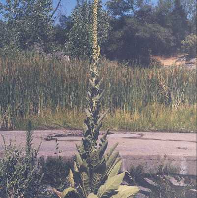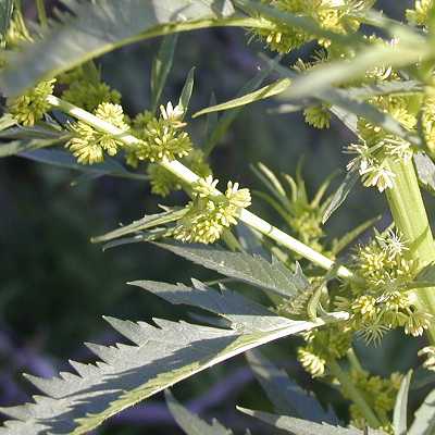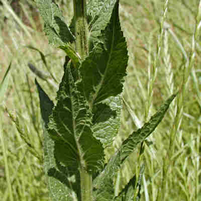 Description: Biennial to 6'. Leaves oval to oblong, sharply toothed and clasping. Flowers in numerous small, elongate heads in open-branched groups. Leaves