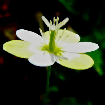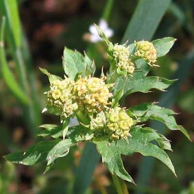 are yellow-green. Below is a whorl of (usually 5) finely toothed, egg-shaped