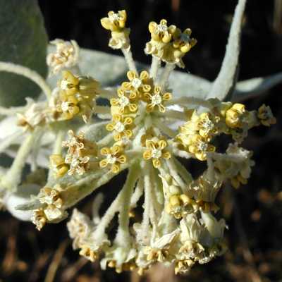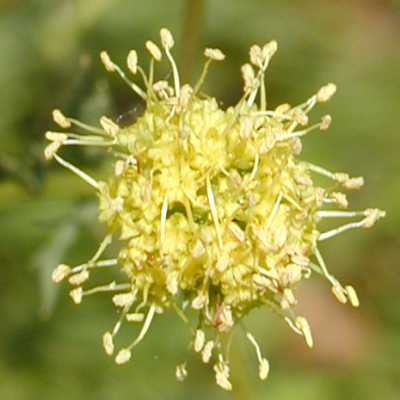 Description: Annual herb, 4"2'. Single 70- to 100-flowered heads. Seed heads are white, 5-petal star shape.