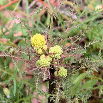 gray-green pinnate-lobed leaves. Yellow prickles cover