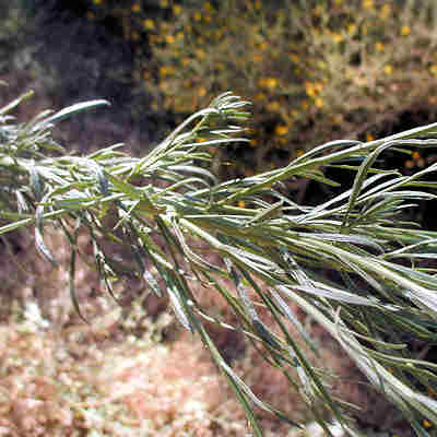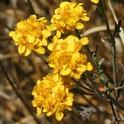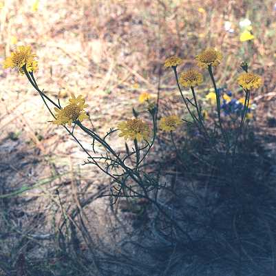 Shrub, 13'. Yellow flowers 1¼", rays not overlapping, in branched clusters. Bluish-green leaves 15", divided into very narrow lobes; upper leaves