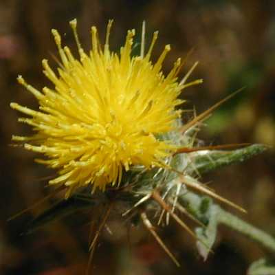 Annual herb, 15'. Yellow flower heads (½¾"), with long spines (¾") below. Cottony-haired leaves linear, extending down the stem. Well branched.